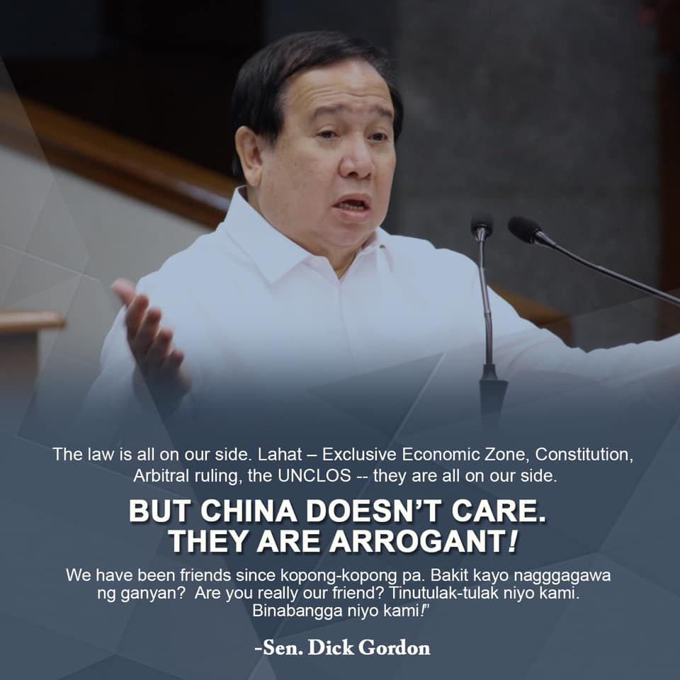 Gordon has been tenaciously vocal in condemning China’s violation of UNCLOS (United Nations Convention on the Law of the Sea) and the ruling of the PCA (Permanent Court of Arbitration) in favor of the Philippines. His foresight into China’s intrusive potential (while presiding as Olongapo mayor) led him to defend the renewal of the U.S. Bases Treaty in 1991. He advocates for the implementation of the Visiting Forces Agreement and Enhanced Defense Cooperation Agreement, which make Philippine military bases accessible to American troops, while providing for training and intelligence to Philippine troops. They also regulate joint military exercises and patrolling of the WPS and give “teeth” to the U.S.-Philippine Mutual Defense Treaty, which Gordon reiterated could be triggered in “an armed attack against the Philippines’ armed forces, public vessels, or aircraft in the Pacific, including in the South China Sea.”