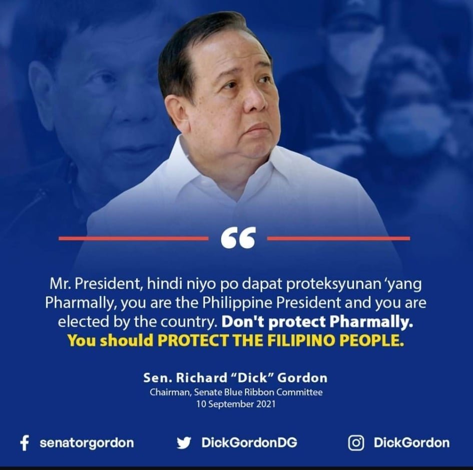 As chairman of the Senate Committee on Accountability of Public Officers and Investigations (Blue Ribbon), Gordon has been the nemesis of malfeasance, misfeasance, and nonfeasance. Presiding over the ongoing Pharmally probe, he has exposed corruption in the collusion of Pharmally Pharmaceutical Corp. directors and officers, former DBM (Department of Budget and Management) officials, a former advisor to President Duterte, and potentially even President Duterte himself. Some of the recommended charges by the Blue Ribbon Committee include violating the Anti-Graft and Corrupt Practices Act, fraud against the public treasury, perjury, falsification of public documents, and disobedience to summons issued by Congress.